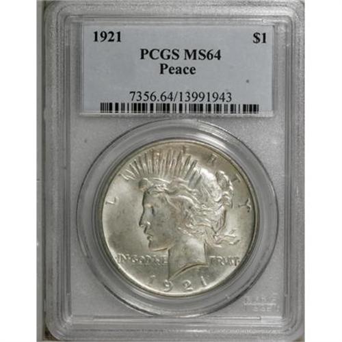 <B>1921 $1 MS64 PCGS.</B></I> Tan-gray speckles make occasional visits to the lustrous surfaces of this near-Gem, especially on the reverse. Generally well struck, better so than most 1921s. A few small handling marks preclude a higher grade.<BR><BR><B>Coin Engraver:</B> Anthony de Francisci<BR><BR><b>Shipping:</b> Coins & Currency (<a target="_blank" href="http://www.heritageauctions.com/common/shipping.php">view shipping information</a>)