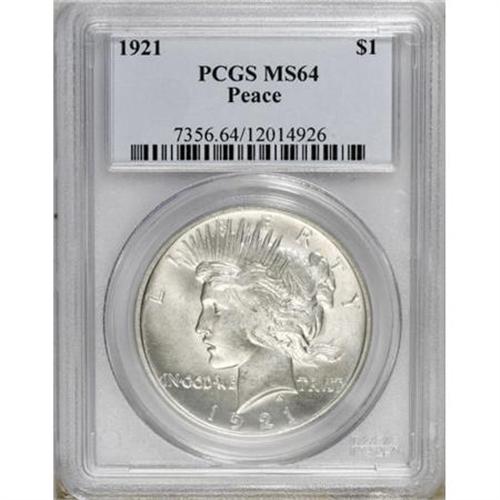 <B>1921 $1 MS64 PCGS.</B></I> Satiny luster and brilliant silver surfaces with sharp design elements, even at the centers. This is a lovely example of the High Relief Peace dollar design.<BR><BR><B>Coin Engraver:</B> Anthony de Francisci<BR><BR><b>Shipping:</b> Coins & Currency (<a target="_blank" href="http://www.heritageauctions.com/common/shipping.php">view shipping information</a>)