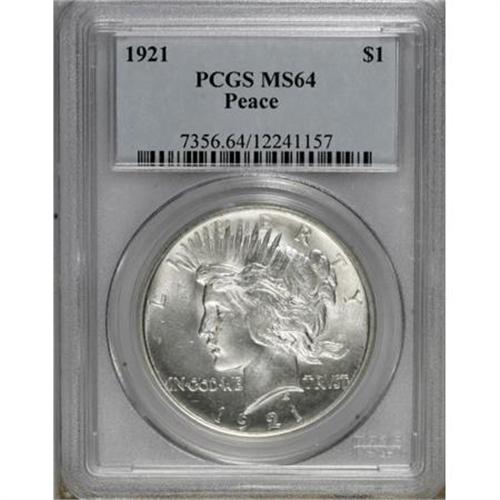 <B>1921 $1 MS64 PCGS.</B></I> This virtually brilliant high relief Peace dollar has sharper than expected definition in the centers, and no marks merit individual mention.<BR><BR><B>Coin Engraver:</B> Anthony de Francisci<BR><BR><b>Shipping:</b> Coins & Currency (<a target="_blank" href="http://www.heritageauctions.com/common/shipping.php">view shipping information</a>)