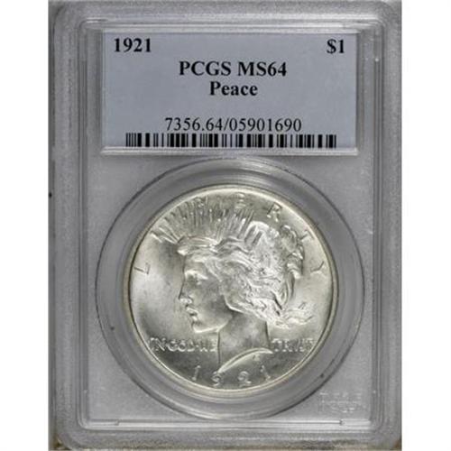 <B>1921 $1 MS64 PCGS.</B></I> This handsome near-Gem is essentially untoned, although glimpses of ice-blue and gold are noted. The reverse is beautifully preserved, while the obverse shows only minor marks. The strike is above average although incomplete.<BR><BR><B>Coin Engraver:</B> Anthony de Francisci<BR><BR><b>Shipping:</b> Coins & Currency (<a target="_blank" href="http://www.heritageauctions.com/common/shipping.php">view shipping information</a>)