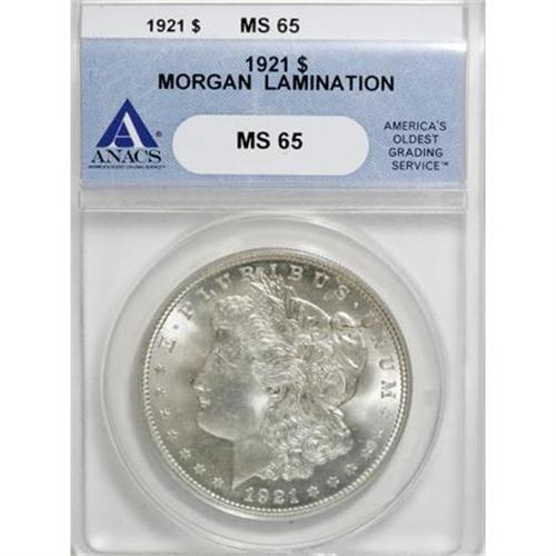 <B>1921 $1 Morgan Dollar--Lamination--MS65 ANACS.</B></I> NGC Census: (7571/660). PCGS Population (4556/469). Mintage: 44,690,000. Numismedia Wsl. Price for NGC/PCGS coin in MS65: $125. (#7296)<BR><BR><b>Shipping:</b> Coins & Currency (<a target="_blank" href="http://www.heritageauctions.com/common/shipping.php">view shipping information</a>)