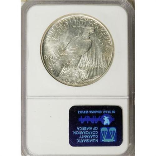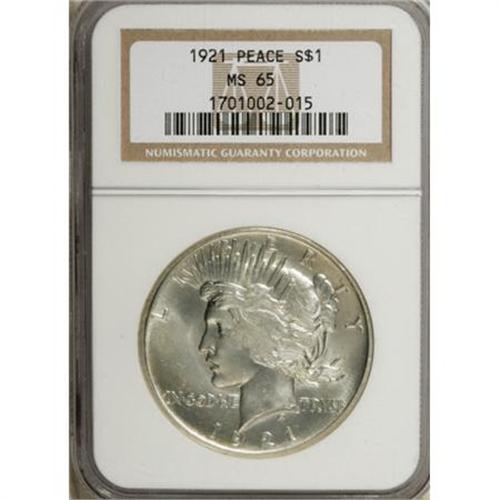 <B>1921 $1 MS65 NGC.</B></I> Though typically soft in the centers, the overall strike of this first-year Peace dollar is above-average. Whispers of hazy gray and tan patina drape strongly lustrous surfaces. Solid eye appeal for the Gem designation. NGC has graded 96 finer pieces (1/08).<BR><BR><B>Coin Engraver:</B> Anthony de Francisci<BR><BR><b>Shipping:</b> Coins & Currency (<a target="_blank" href="http://www.heritageauctions.com/common/shipping.php">view shipping information</a>)