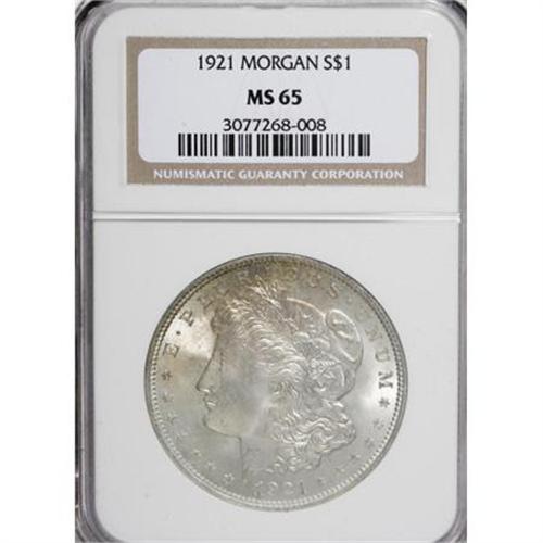 <B>1921 $1 MS65 NGC.</B></I> . NGC Census: (7541/655). PCGS Population (4529/463). Mintage: 44,690,000. Numismedia Wsl. Price for NGC/PCGS coin in MS65: $125. (#7296)<BR><BR><b>Shipping:</b> Coins & Currency (<a target="_blank" href="http://www.heritageauctions.com/common/shipping.php">view shipping information</a>)