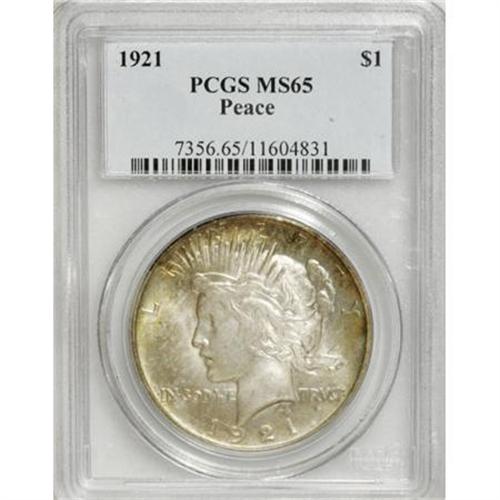 <B>1921 $1 MS65 PCGS.</B></I> An extraordinary Gem with a bolder than usual strike and unusually rich color (for a Peace dollar) circling the pearl-gray obverse. Vibrant orange, yellow and russet tones are seen on the obverse while the reverse has just a hint of gold at the rims. A tiny lamination, as struck, is noted on the reverse below the A in PEACE. A pretty dollar worthy of a premium bid.<BR><BR><B>Coin Engraver:</B> Anthony de Francisci<BR><BR><b>Shipping:</b> Coins & Currency (<a target="_blank" href="http://www.heritageauctions.com/common/shipping.php">view shipping information</a>)