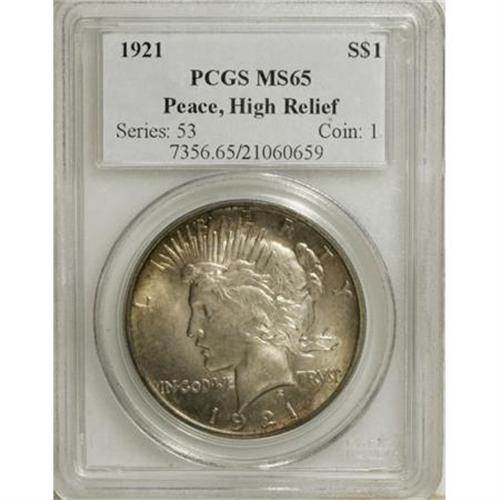 <B>1921 $1 MS65 PCGS.</B></I> Rich gray-gold patina bathes lustrous surfaces on this attractive first-year Gem. A few unobtrusive marks are present on Liberty's portrait, but these minor quibbles are consistent with the grade.<BR><BR><B>Coin Engraver:</B> Anthony de Francisci<BR><BR><b>Shipping:</b> Coins & Currency (<a target="_blank" href="http://www.heritageauctions.com/common/shipping.php">view shipping information</a>)