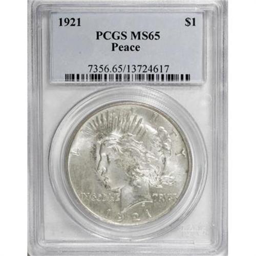 <B>1921 $1 MS65 PCGS.</B></I> Though the centers show typical softness, this luminous Gem is well-defined elsewhere. Primarily silver-gray with deeper russet shadings at Liberty's chin and in splashes near the rims.<BR><BR><B>Coin Engraver:</B> Anthony de Francisci<BR><BR><b>Shipping:</b> Coins & Currency (<a target="_blank" href="http://www.heritageauctions.com/common/shipping.php">view shipping information</a>)