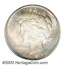 <table><tr><td><TABLE cellSpacing=0 cellPadding=0 width="100%" bgColor=#000000 border=0><TBODY> <TR><TD width="100%"><TABLE cellSpacing=1 cellPadding=3 width="100%" border=0><TBODY><TR><TD width="100%" bgColor=#79735c><FONT face=arial color=#ffffff size=3><B>Description</B> </FONT></TD></TR><TR><TD width="100%" bgColor=#ffffff><FONT face=arial size=2><B>1921 $1 MS66 NGC.</B></I> Only one million Peace Dollars were struck in 1921, all of which had the distinctive high relief design seen only in this year. This is an especially well struck example that has complete feathers on the lowest row of the eagle's wing on the reverse. Each side displays absolutely sensational purple-gray toning, with exceptional mint frost and a trace of pastel orange iridescence near the lower obverse rim. The surfaces exhibit two or three light marks, but you will need a magnifier to see them. A radiantly beautiful example, unmistakably qualified to be graded as a premium quality Gem. Population: 42 in 66, 2 finer (7/03). </FONT></TD></TR></TBODY></TABLE></TD></TR></TBODY></TABLE><BR><A name=PricesRealized></A><TABLE cellSpacing=0 cellPadding=0 width="100%" bgColor=#000000 border=0><TBODY><TR><TD width="100%"><TABLE cellSpacing=1 cellPadding=3 width="100%" border=0><TBODY><TR><TD width="100%" bgColor=#79735c><A name=PR><FONT face=arial color=#ffffff size=3><B>Previous Prices from Heritage Auctions</B> </FONT></A></TD></TR><TR><TD bgColor=#f6f6ed><TABLE cellSpacing=0 cellPadding=0 width="100%" border=1><TBODY><TR><TD align=middle width="33%"><B>Date</B></TD><TD align=middle width="33%"><B>Service</B></TD><TD align=middle width="33%"><B>Price</B></TD></TR><TR bgColor=whitesmoke><TD width="33%"><B>09/03/2002</B></TD><TD width="33%">NGC</TD><TD width="33%">$4,370.00</TD></TR><TR bgColor=whitesmoke><TD width="33%"><B>05/31/2003</B></TD><TD width="33%">PCGS</TD><TD width="33%">$5,060.00</TD></TR><TR bgColor=whitesmoke><TD width="33%"><B>01/11/2003</B></TD><TD width="33%">PCGS</TD><TD width="33%">$5,520.00</TD></TR><TR bgColor=whitesmoke><TD width="33%"><B>07/30/2002</B></TD><TD width="33%">NGC</TD><TD width="33%">$3,795.00</TD></TR><TR bgColor=whitesmoke><TD width="33%"><B>02/24/2002</B></TD><TD width="33%">NGC</TD><TD width="33%">$3,450.00</TD></TR><TR bgColor=whitesmoke><TD width="33%"><B>01/12/2002</B></TD><TD width="33%">PCGS</TD><TD width="33%">$5,175.00</TD></TR><TR bgColor=whitesmoke><TD width="33%"><B>02/23/2001</B></TD><TD width="33%">PCGS</TD><TD width="33%">$3,565.00</TD></TR><TR bgColor=whitesmoke><TD width="33%"><B>05/05/2000</B></TD><TD width="33%">PCGS</TD><TD width="33%">$5,635.00</TD></TR><TR bgColor=whitesmoke><TD width="33%"><B>01/07/2000</B></TD><TD width="33%">PCGS</TD><TD width="33%">$6,325.00</TD></TR><TR bgColor=whitesmoke><TD width="33%"><B>03/21/1998</B></TD><TD width="33%">PCGS</TD><TD width="33%">$6,612.50</TD></TR><TR bgColor=whitesmoke><TD width="33%"><B>09/01/1997</B></TD><TD width="33%">NGC</TD><TD width="33%">$3,520.00</TD></TR><TR bgColor=whitesmoke><TD width="33%"><B>09/01/1999</B></TD><TD width="33%">PCGS</TD><TD width="33%">$6,670.00</TD></TR><TR bgColor=whitesmoke><TD width="33%"><B>01/01/2000</B></TD><TD width="33%">PCGS</TD><TD width="33%">$4,830.00</TD></TR><TR bgColor=whitesmoke><TD width="33%"><B>03/21/2002</B></TD><TD width="33%">NGC</TD><TD width="33%">$3,795.00</TD></TR><TR bgColor=whitesmoke><TD width="33%"><B>08/09/2000</B></TD><TD width="33%">NGC</TD><TD width="33%">$2,990.00</TD></TR></TBODY></TABLE></TD></TR><TR><TD bgColor=#ffffff><FONT face=arial size=1 ?>PLEASE NOTE: All prices realized reflect the final hammer price PLUS the buyer's premium in auctions that charge a buyer's premium. Each item has a notation at the top of the listing indicating whether that lot included a buyer's premium. Example: A item that sells with a final hammer price of $100 and a 20% buyer's premium will display with a price realized of $120. All information listed is intended to be as accurate as possible, but errors are possible. Please use this guide carefully and inform us of any inaccuracies. </FONT></TD></TR></TBODY></TABLE></TD></TR></TBODY></TABLE><BR><TABLE cellSpacing=0 cellPadding=0 width="100%" bgColor=#000000 border=0><TBODY><TR><TD width="100%"><TABLE cellSpacing=1 cellPadding=3 width="100%" border=0><TBODY><TR><TD width="100%" bgColor=#79735c colSpan=6><FONT face=arial color=#ffffff size=3><B>Price Guide*</B> </FONT></TD></TR><TR bgColor=#f6f6ed><TD align=middle><B>Grade</B> </TD><TD align=middle><B>Coin World<BR>(Trends)</B> </TD><TD align=middle><B>Numismedia<BR>Retail</B> </TD><TD align=middle><B>Numismedia<BR>Wholesale</B> </TD><TD align=middle><B>Coin<BR>Universe</B> </TD><TD align=middle><B>Heritage<BR>Value Index</B> </TD></TR><TR bgColor=#ffffff><TD align=middle>65</TD><TD align=right>$2,500.00</TD><TD align=right>---</TD><TD align=right>$1,675.00</TD><TD align=right>$2,500.00</TD><TD align=right>$1,681.25</TD></TR><TR style="FONT-WEIGHT: bold" bgColor=#cccfdd><TD align=middle>66</TD><TD align=right>$7,500.00</TD><TD align=right>---</TD><TD align=right>$5,100.00</TD><TD align=right>$7,700.00</TD><TD align=right>$5,015.25</TD></TR><TR bgColor=#ffffff><TD align=middle>67</TD><TD align=right>---</TD><TD align=right>---</TD><TD align=right>$28,500.00</TD><TD align=right>---</TD><TD align=right>$45,000.00</TD></TR><TR bgColor=#ffffff><TD colSpan=6><FONT size=1>*All information listed is intended to be as accurate as possible, but errors are possible. No item may be returned or refused based on this information which is provided as a service to our customers. You should contact each pricing source directly to determine the accuracy of this information. </FONT></TD></TR></TBODY></TABLE></TD></TR></TBODY></TABLE><BR><TABLE cellSpacing=0 cellPadding=0 width="100%" bgColor=#000000 border=0><TBODY><TR><TD width="100%"><TABLE cellSpacing=1 cellPadding=3 width="100%" border=0><TBODY><TR><TD width="100%" bgColor=#79735c><FONT face=arial color=#ffffff size=3><B>Population Guide</B> 