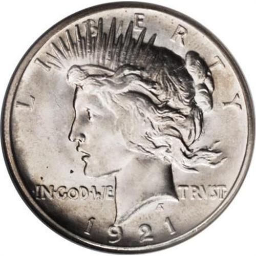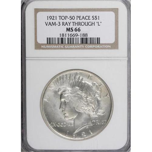 <B>1921 $1 MS66 NGC.</B></I> VAM-3. A Top 50 Variety. The "Ray Through L" variety. The reverse die was modified by hand by a mint worker to extend the ray over the first L in DOLLAR. This is a scarce and desirable VAM, particularly in the MS66 grade. In fact, as of (6/07), the present lot is the single finest example of VAM-3 certified by NGC. Lustrous and carefully preserved with delicate almond-gold and ice-blue toning. The centers are somewhat soft, nearly always the case for this high relief date.<BR><BR><b>Shipping:</b> Coins & Currency (<a target="_blank" href="http://www.heritageauctions.com/common/shipping.php">view shipping information</a>\)