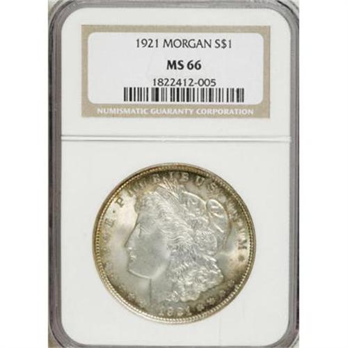 <B>1921 $1 MS66 NGC.</B></I> An unusually lustrous example. Nuanced chocolate brown color clings to the rims while the balance of the surfaces are toned a pleasing light silver-peach. More prominent olive-green tones habituates the reverse. The luster is plentiful, but surface marks are not. NGC has graded only 14 finer (12/07).<BR><BR><b>Shipping:</b> Coins & Currency (<a target="_blank" href="http://www.heritageauctions.com/common/shipping.php">view shipping information</a>)