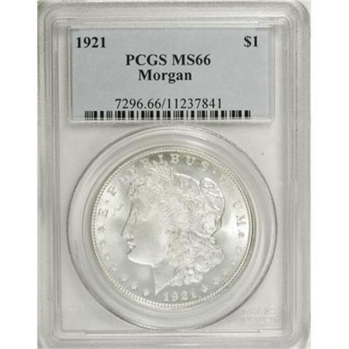 <B>1921 $1 MS66 PCGS.</B></I> Sharply struck with dazzling mint luster. The surfaces are brilliant and lack the abrasions normally encountered on this common, high mintage issue. <BR><BR><b>Shipping:</b> Coins & Currency (<a target="_blank" href="http://www.heritageauctions.com/common/shipping.php">view shipping information</a>)