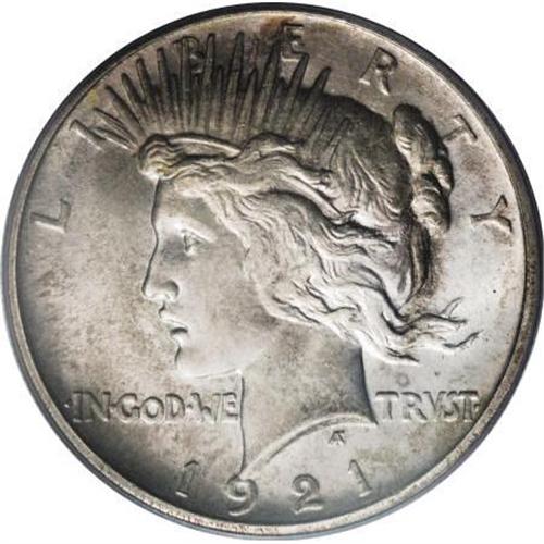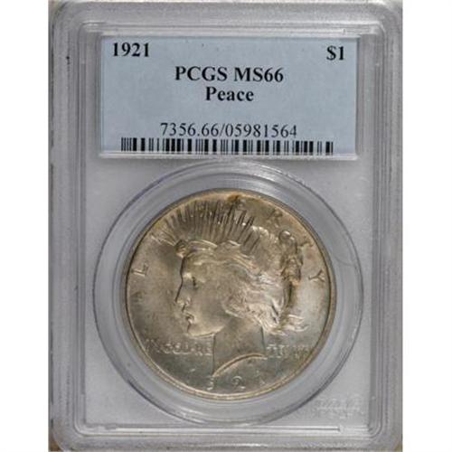 <B>1921 $1 MS66 PCGS.</B></I> Delicate splashes of gold toning grace the ivory surfaces of this lovely coin. Both sides have full satin luster, and the most remarkable aspect of this piece is the strike. Although not fully struck, this piece is more intricately detailed than most. For example, the boundary line between the hair and cheek is full and complete, as is the similar boundary between the eagle's wing and leg. Only six finer examples of this date have been certified by PCGS (8/07).<BR><BR><B>Coin Engraver:</B> Anthony de Francisci<BR><BR><b>Shipping:</b> Coins & Currency (<a target="_blank" href="http://www.heritageauctions.com/common/shipping.php">view shipping information</a>)