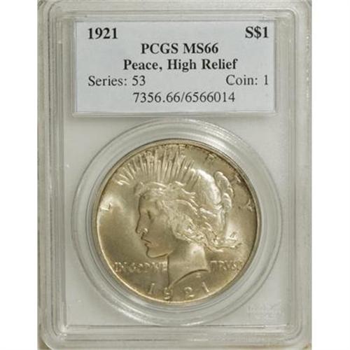 <B>1921 $1 MS66 PCGS.</B></I> The extra eye appeal that this coin possesses is largely derived from the fulsome mint frost that covers each side. Additionally, both the obverse and reverse have a light layer of reddish-golden patina that adds even more to the visual appeal of this special coin. As one would expect, marks are at an absolute minimum and the strike is above average for this normally weak issue. PCGS has seen six pieces finer.<BR><BR><B>Coin Engraver:</B> Anthony de Francisci<BR><BR><b>Shipping:</b> Coins & Currency (<a target="_blank" href="http://www.heritageauctions.com/common/shipping.php">view shipping information</a>)