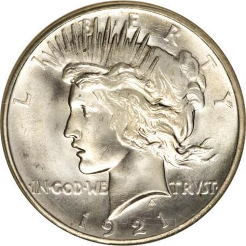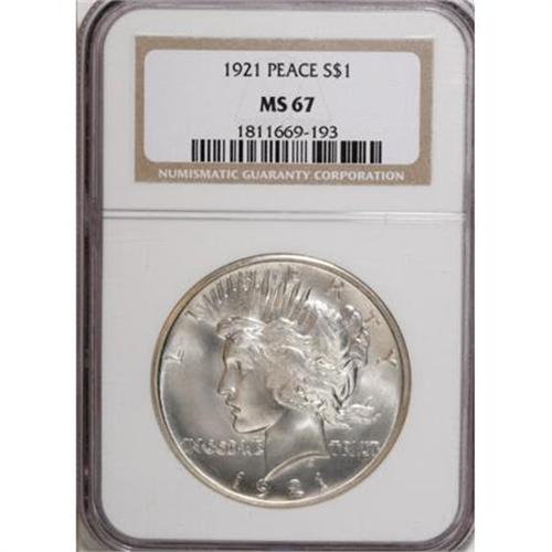 <B>1921 $1 MS67 NGC.</B></I> After the close of the Great War, there was a proposal for a Victory coin to commemorate the cessation of hostilities. Later, Farran Zerbe was instrumental in converting the idea from a Victory coin to a Peace coin. Anthony de Francisci won the design competition for the new Peace coin and used his 23-year old wife as his model. De Francisci took a cue from Theodore Roosevelt and Augustus Saint-Gaudens and looked back in time for inspiration for his coin. He used a 'radiate' crown similar to that seen on certain ancient Roman coins, but this was also intended to suggest the Statue of Liberty.<BR> Although saved in significant numbers as a first-year issue, the 1921 is a conditionally challenging coin that is usually found with numerous distracting bagmarks. Strike is also a problem for this issue, as the high relief of the design often resulted in soft definition in the centers. This is a truly amazing specimen. The surfaces are uncommonly clean with a smooth, virtually untouched cheek on Liberty's portrait. The striking quality is above average for the issue with sharpness of detail in most areas and emerging definition over the central highpoints. Finally, the luster is exceptionally radiant with a swirling, frosty texture. A completely brilliant appearance is seen on each side. This coin was obviously well cared for since the day of issue, and we have no doubt that the consignor also handpicked it for extraordinary technical quality and awe-inspiring eye appeal.<BR><I>From The Madison Collection.</B></I><BR><BR><B>Coin Engraver:</B> Anthony de Francisci<BR><BR><b>Shipping:</b> Coins & Currency (<a target="_blank" href="http://www.heritageauctions.com/common/shipping.php">view shipping information</a>)