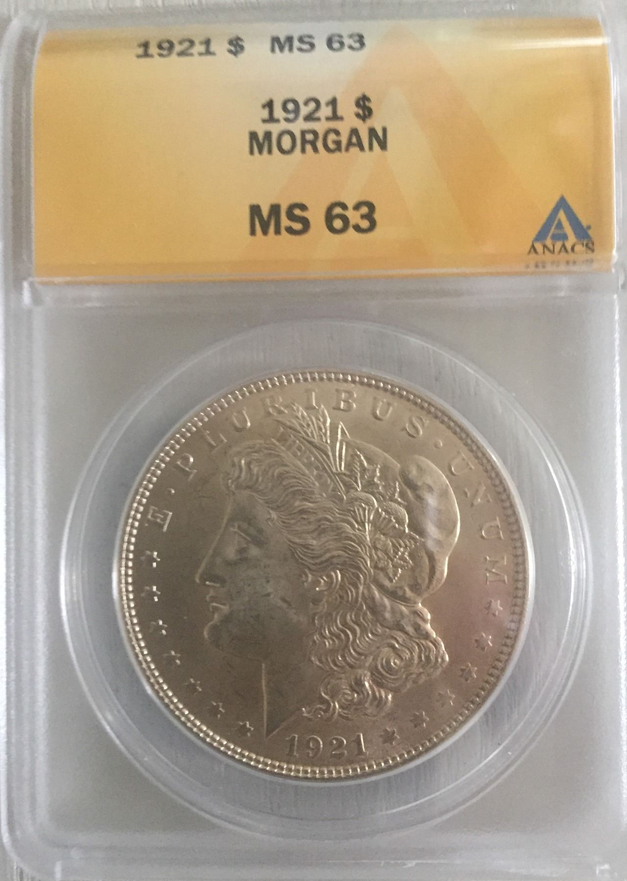One 1921 $1 Morgan Dollar Coin ANACS MS63.