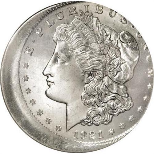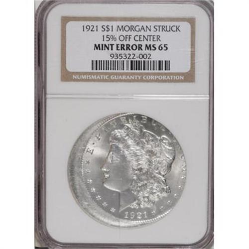<B>1921 $1 Morgan Dollar--Struck 15% Off Center--MS65 NGC.</B></I> Struck 15% off-center toward 2 o'clock, taking about half of UNUM off the flan. The remaining right side legends are mostly intact. A wide band of unstruck surface is centered at 8 o'clock, though the date and the space where a mintmark might have been are plain. A brilliant and thoroughly lustrous Gem. The strike is exceptionally sharp for a 1921-dated Morgan dollar, particularly on the wreath.<BR> Morgan dollar errors are highly popular with collectors, with their large size and historic appeal as major draws. In the <I>Guide Book</B></I>, among errors listed, the Morgan and other silver dollars rank as the most expensive pieces in a majority of categories, and specialists are cognizant of how elusive such pieces can be. An interesting and important oddity.<BR> <BR><BR><b>Shipping:</b> Coins & Currency (<a target="_blank" href="http://www.heritageauctions.com/common/shipping.php">view shipping information</a>)