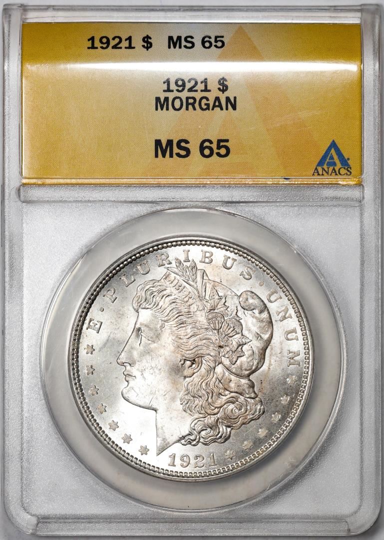 One 1921 $1 Morgan Silver Dollar Coin ANACS MS65. ANACS Certified.
