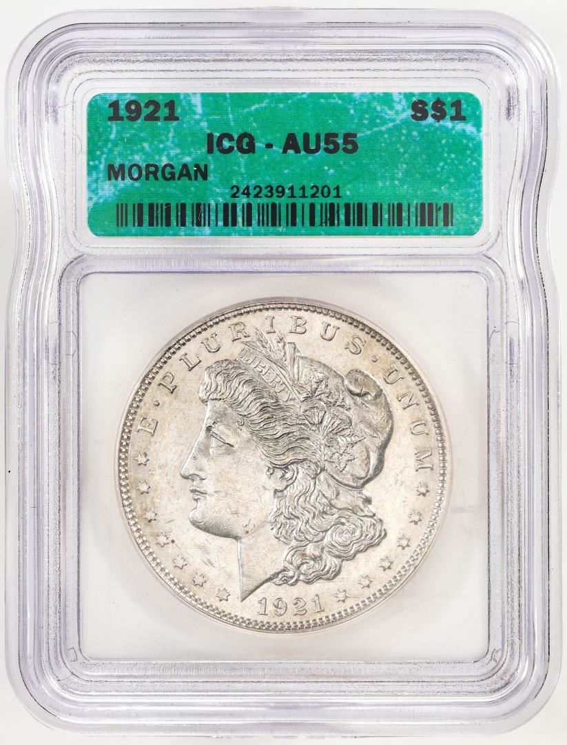 One 1921 $1 Morgan Silver Dollar Coin ICG AU55. ICG Certified.