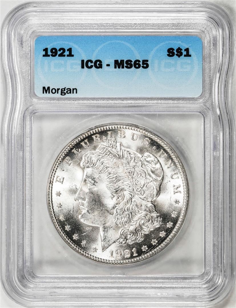 One 1921 $1 Morgan Silver Dollar Coin ICG MS65. ICG Certified.