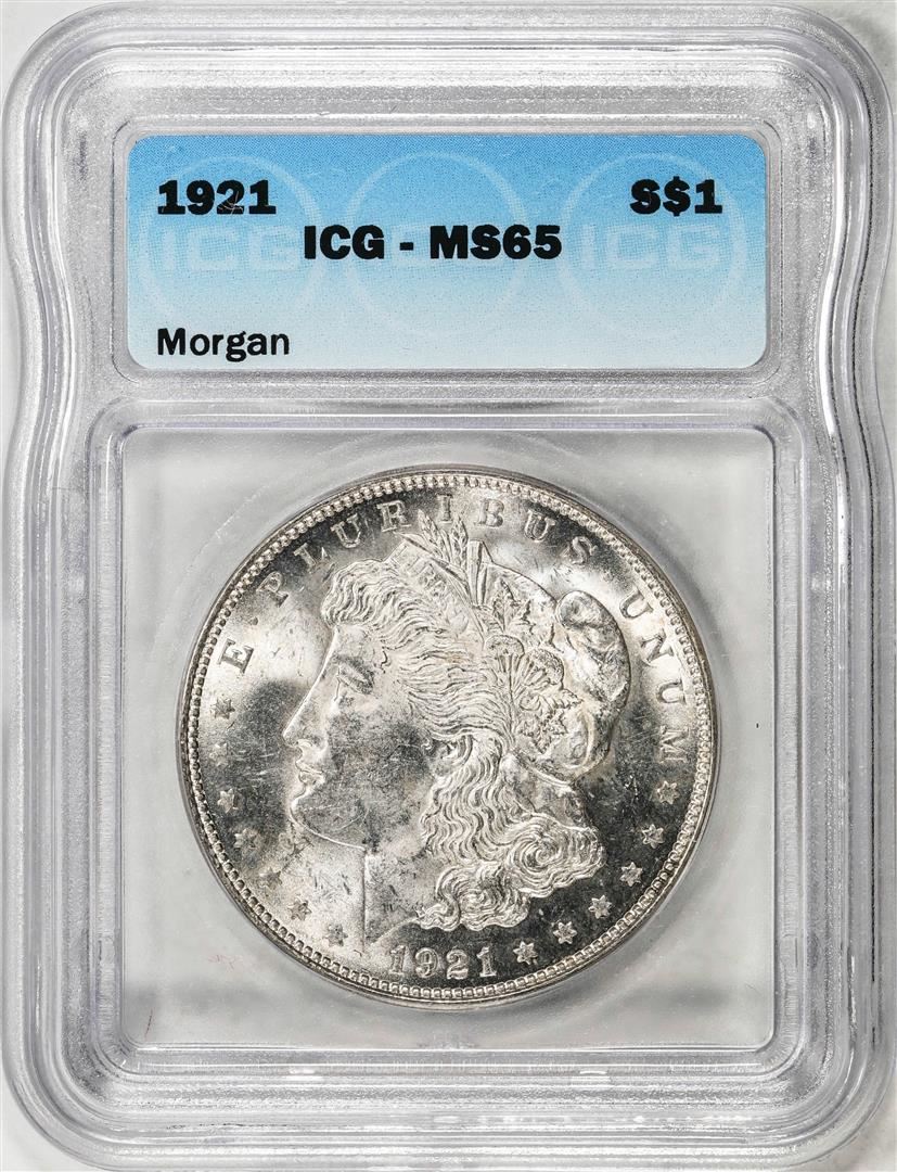 One 1921 $1 Morgan Silver Dollar Coin ICG MS65. ICG Certified.