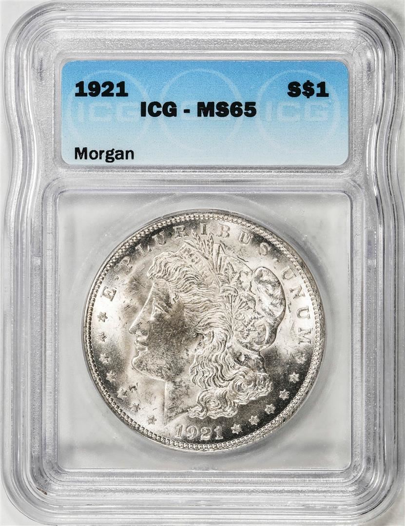 One 1921 $1 Morgan Silver Dollar Coin ICG MS65. ICG Certified.