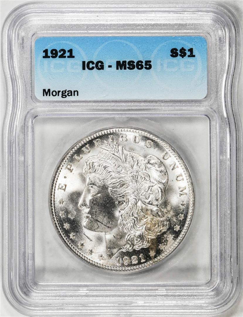 One 1921 $1 Morgan Silver Dollar Coin ICG MS65. ICG Certified.