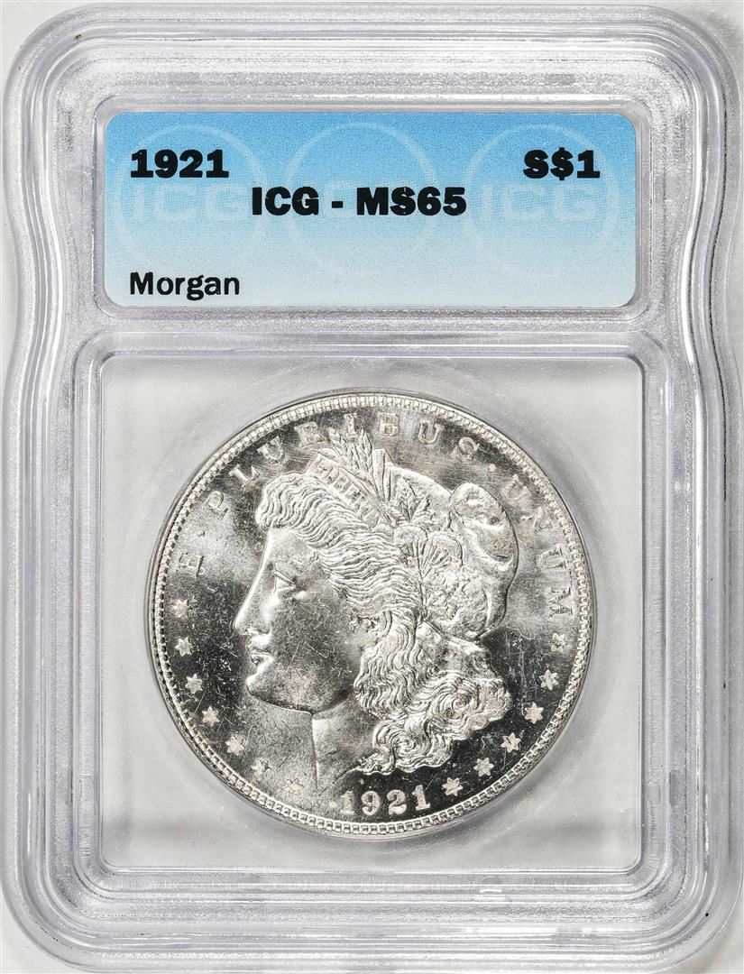 One 1921 $1 Morgan Silver Dollar Coin ICG MS65. ICG Certified.