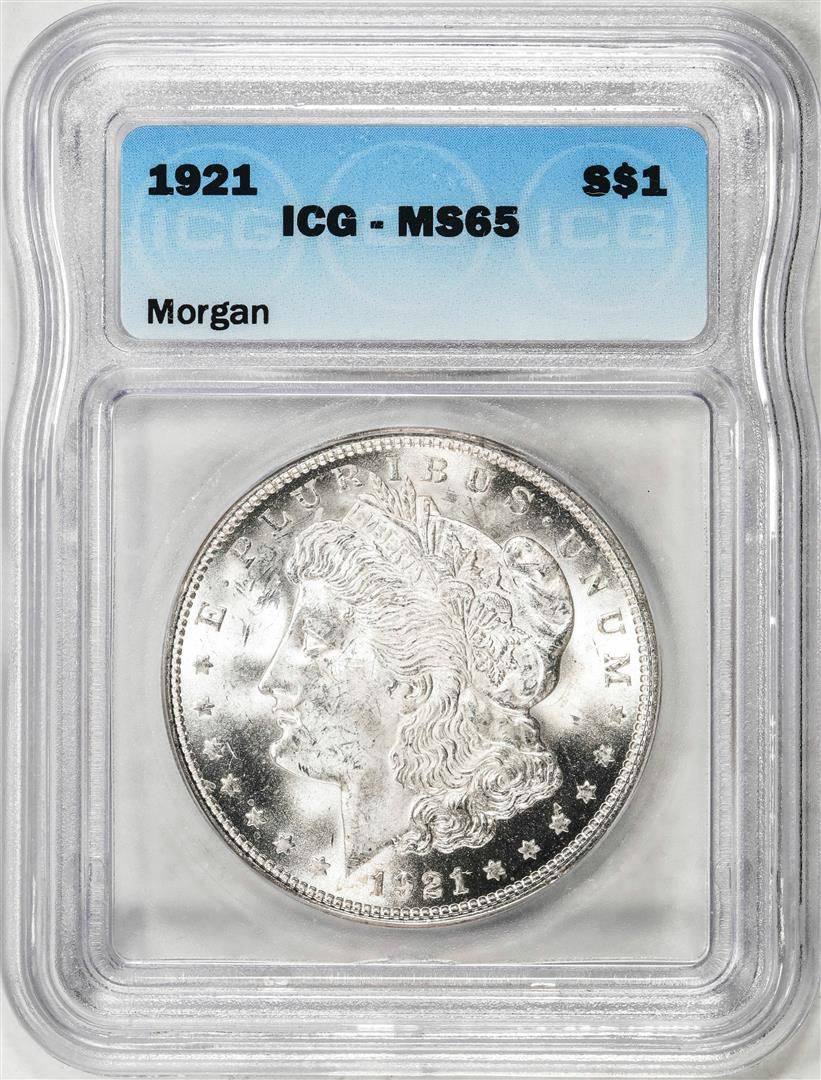 One 1921 $1 Morgan Silver Dollar Coin ICG MS65. ICG Certified.