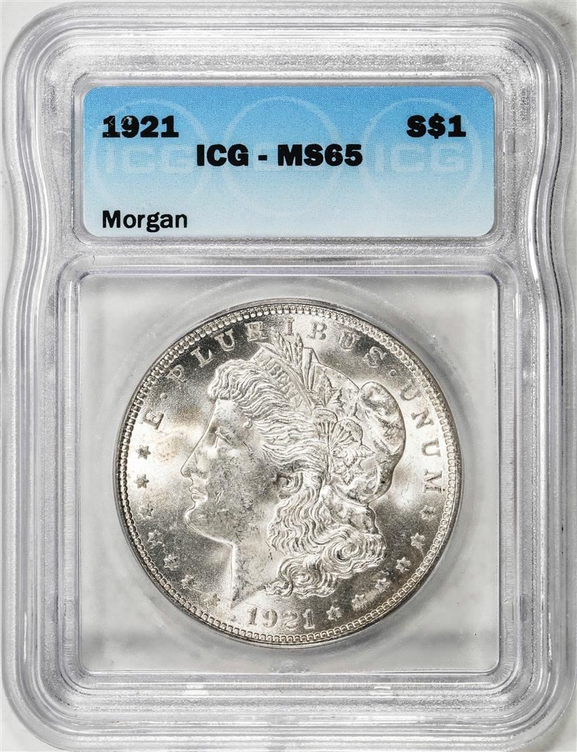 One 1921 $1 Morgan Silver Dollar Coin ICG MS65. ICG Certified.