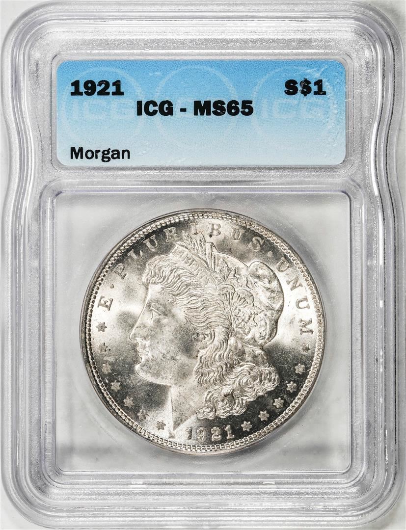 One 1921 $1 Morgan Silver Dollar Coin ICG MS65. ICG Certified.