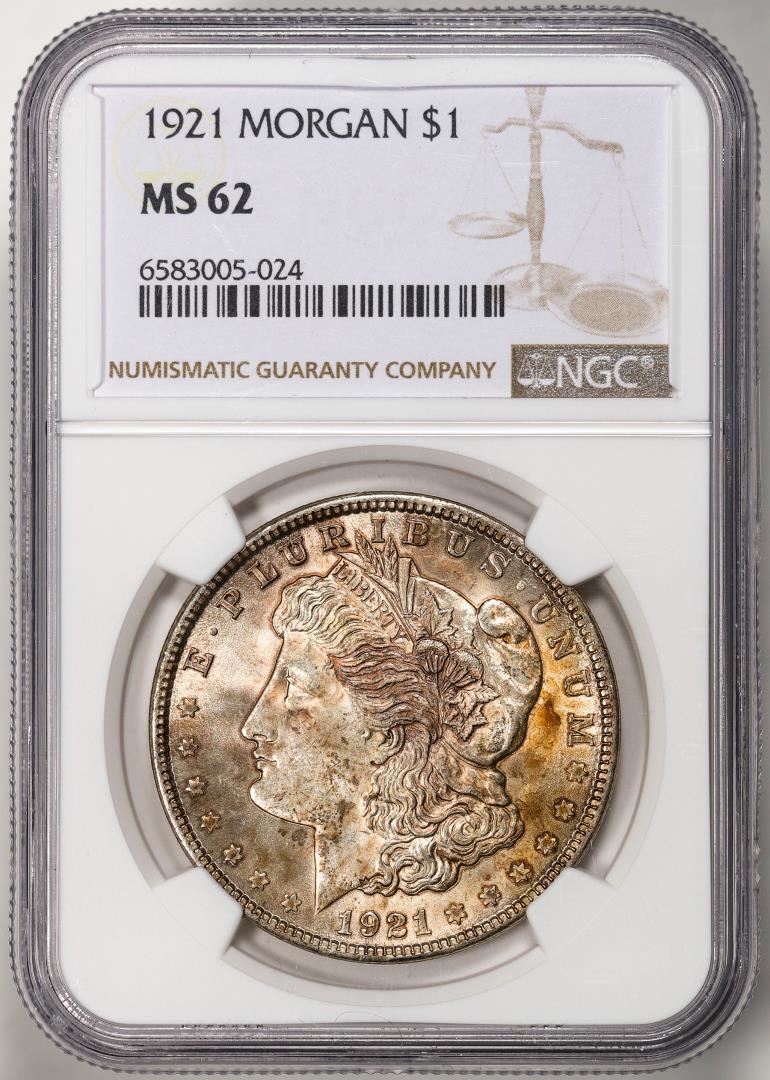 One 1921 $1 Morgan Silver Dollar Coin NGC MS62. NGC Certified.