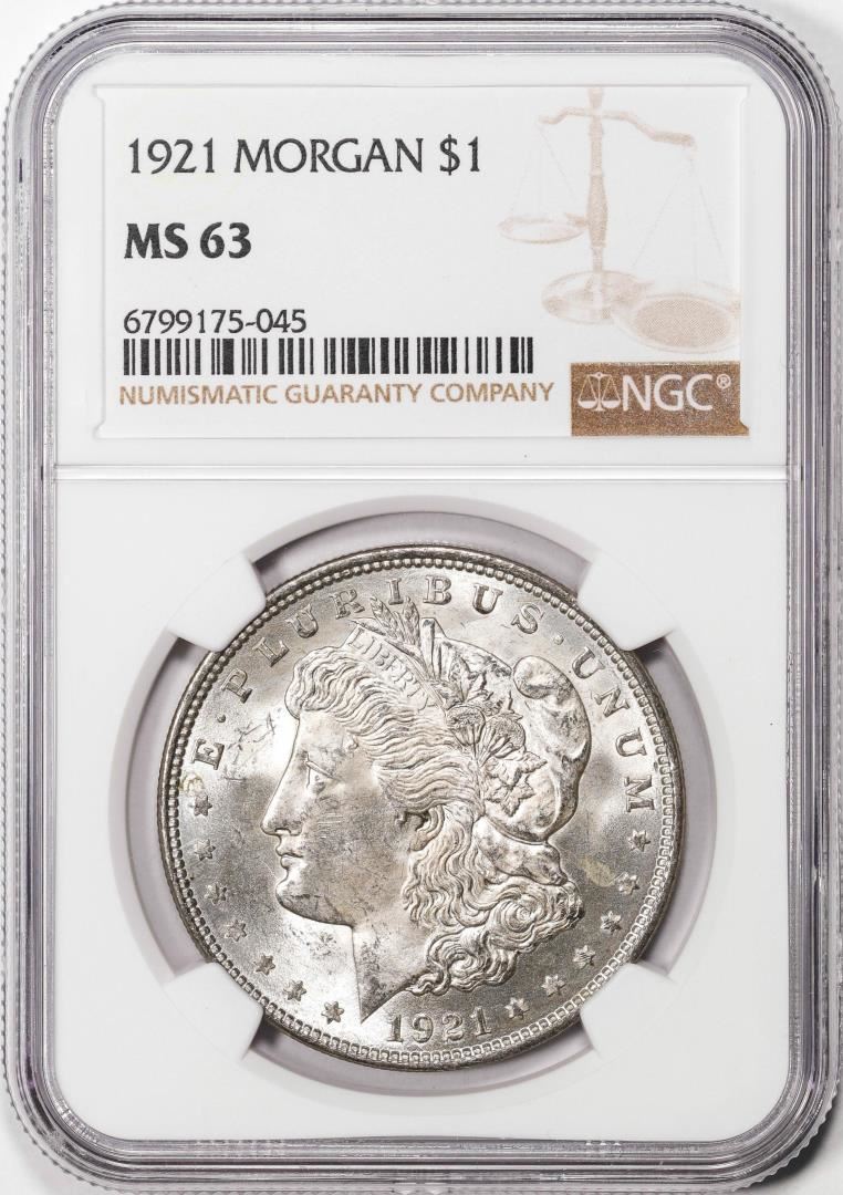 One 1921 $1 Morgan Silver Dollar Coin NGC MS63. NGC Certified.