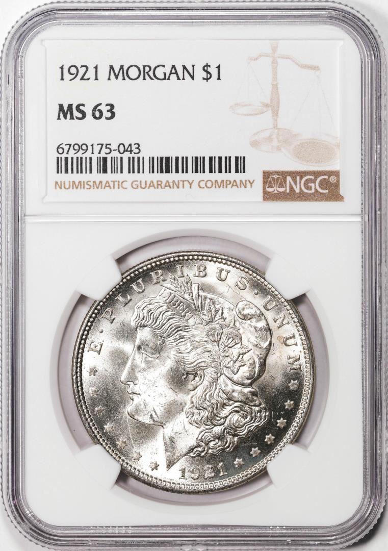 One 1921 $1 Morgan Silver Dollar Coin NGC MS63. NGC Certified.