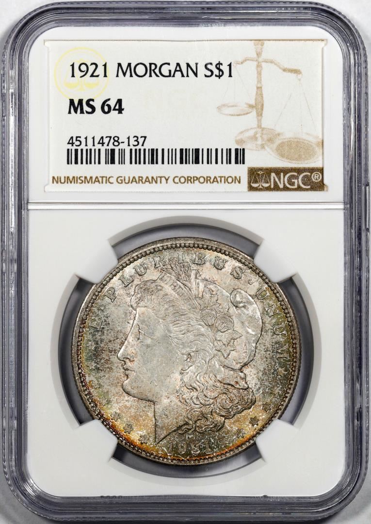 One 1921 $1 Morgan Silver Dollar Coin NGC MS64 Great Toning. NGC Certified.