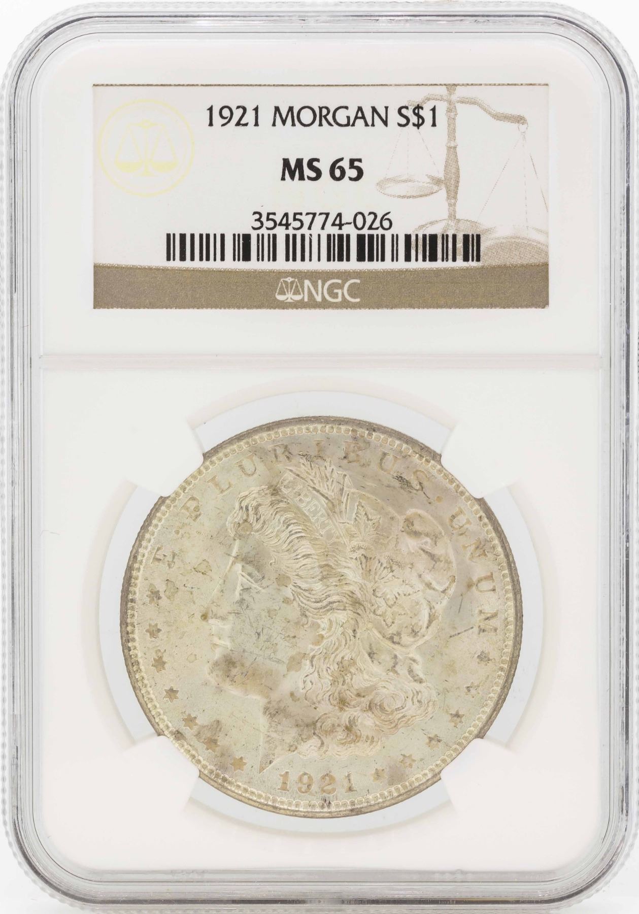 One 1921 $1 Morgan Silver Dollar Coin NGC MS65.