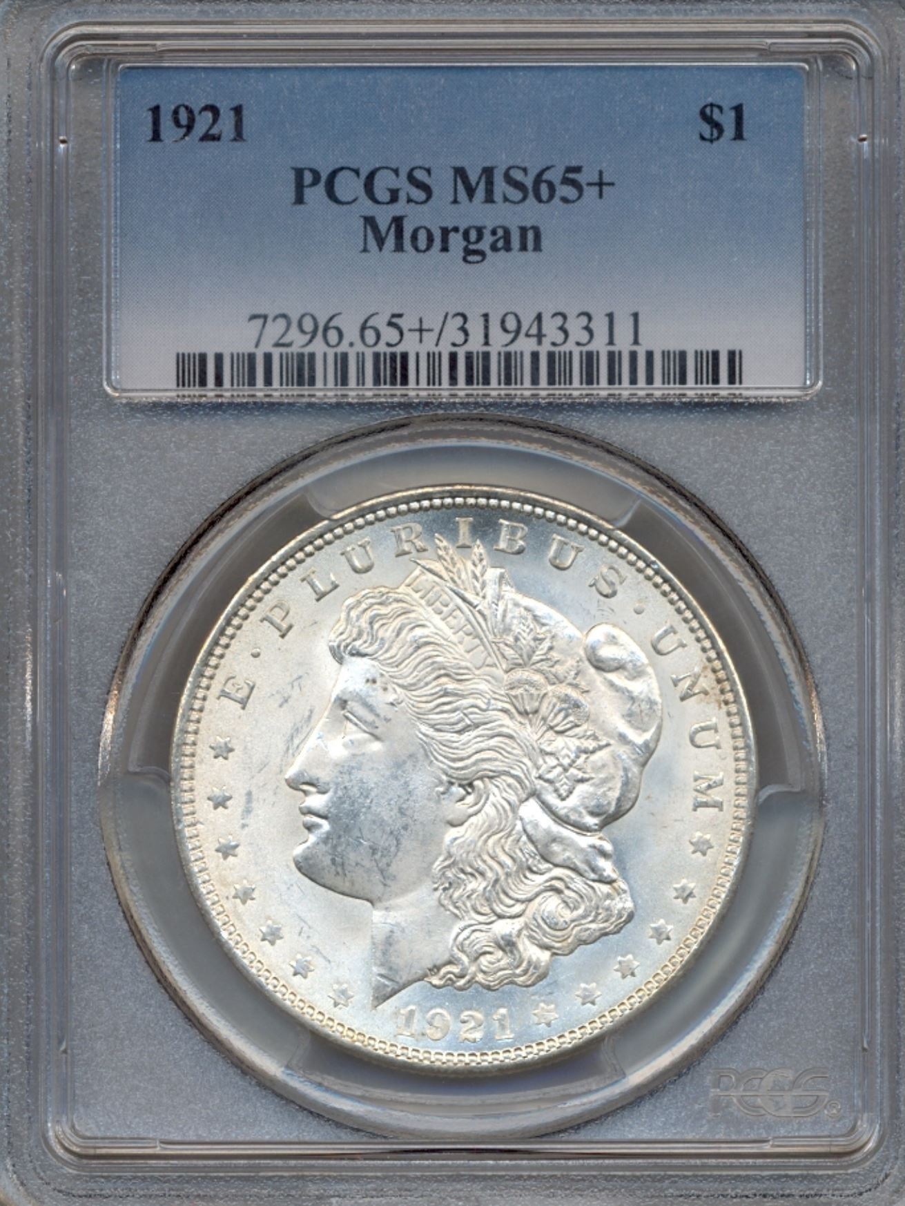 One 1921 $1 Morgan Silver Dollar Coin PCGS MS65+.