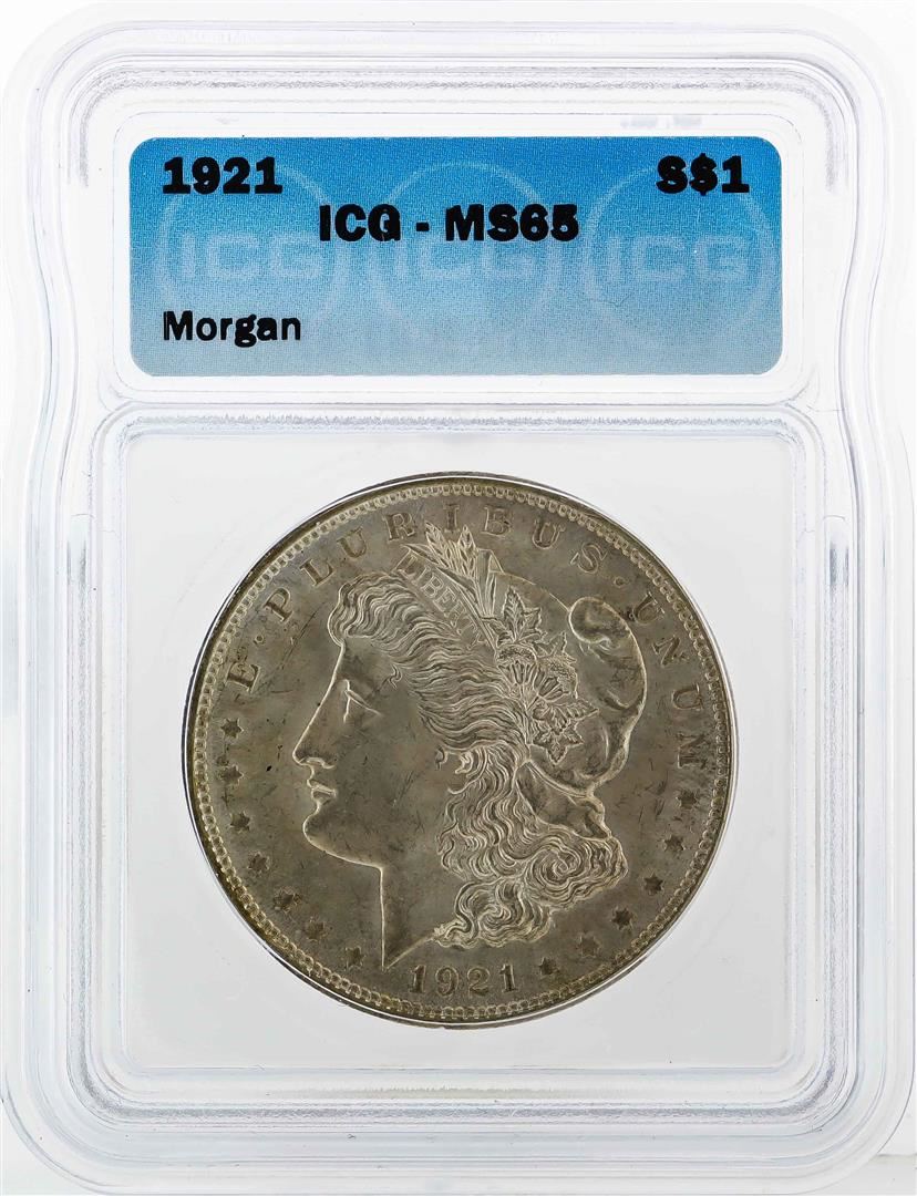 One 1921 $1 Morgan Silver Dollar ICG MS65.