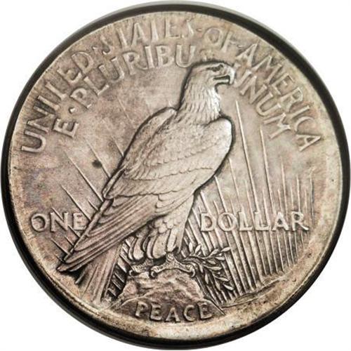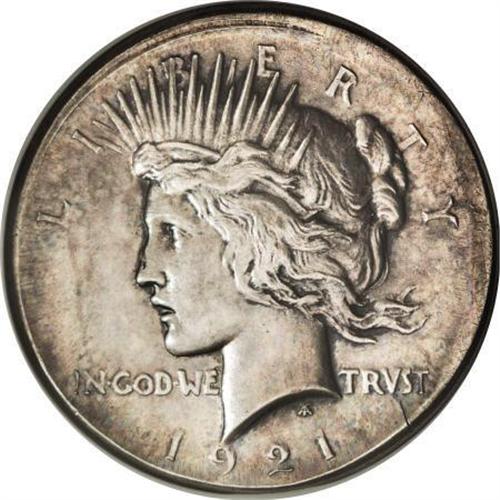 <B>1921 $1 Peace Dollar--Broadstruck--MS60 NGC.</B></I> Broadstruck Peace dollars are rare in any event, but a 1921 example is especially desirable. It is the first year of design, and is the only high relief date struck for circulation. It is a low mintage date, barely exceeding 1 million pieces. Most 1921 Peace dollars have softly struck centers, but the present piece has unusually bold definition, since the absence of the collar die allowed the obverse and reverse dies to closely approach. UNITED STATES OF AMERICA displays spreading toward the rim, and the rim is uncommonly broad from 12 to 3 o'clock. Satiny with medium gold, rose, and ice-blue toning.<BR><BR><B>Coin Engraver:</B> Anthony de Francisci<BR><BR><b>Shipping:</b> Coins & Currency (<a target="_blank" href="http://www.heritageauctions.com/common/shipping.php">view shipping information</a>)