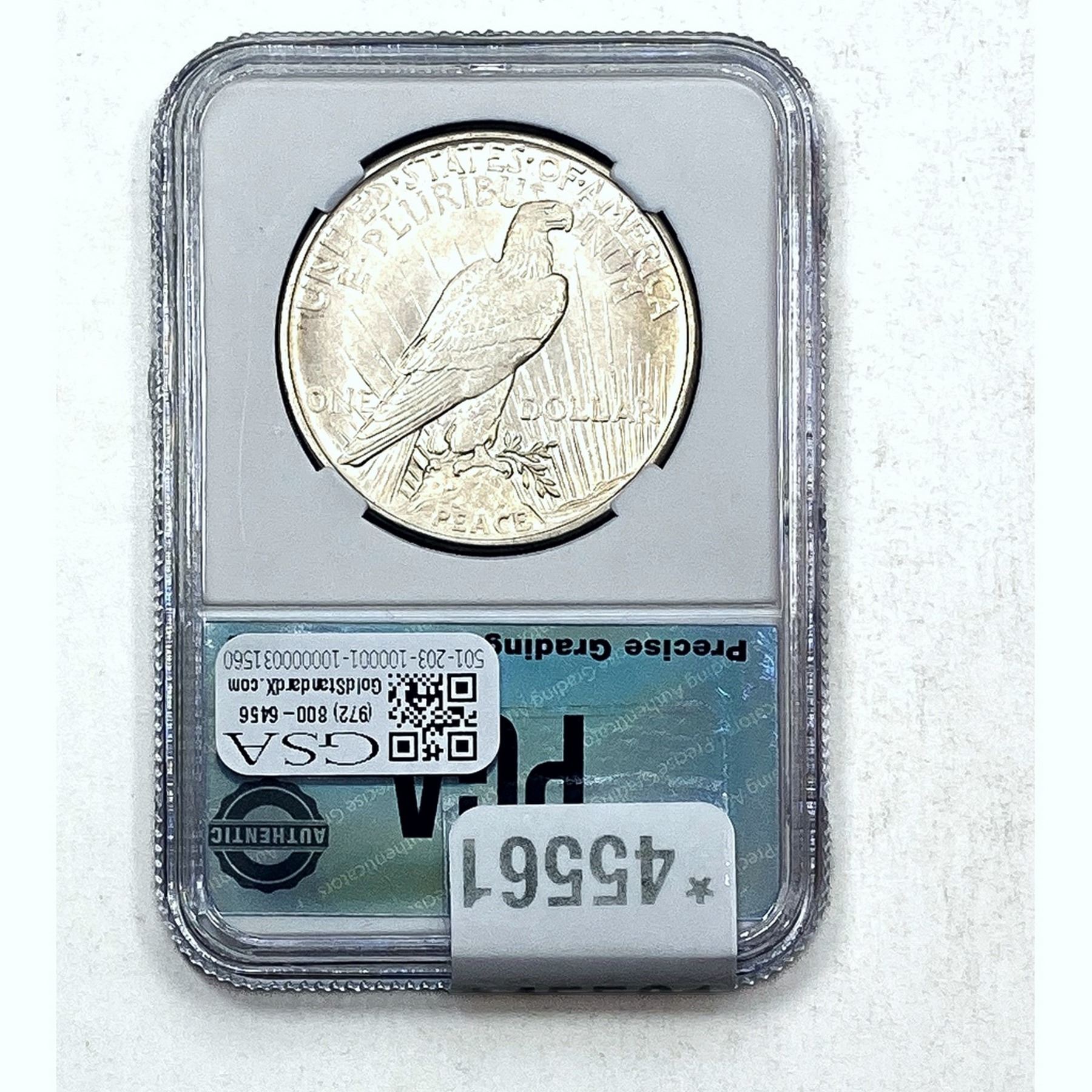 COINS AND CURRENCY LISTED IN GSA’S CATALOG AS GRADED AND ENCAPSULATED BY PCGS, NGC, ANACS, ICG, PCGS CURRENCY, PMG, PCGS BANKNOTE GRADING, CMC OR ANY OTHER THIRD-PARTY GRADING SERVICE ARE LIKEWISE SOLD “AS-IS” EXCEPT AS EXPRESSLY SET FORTH HEREIN. ALL THIRD-PARTY GRADING SERVICE GUARANTEES, INCLUDING AUTHENTICITY, ARE THE SOLE RESPONSIBILITY OF THE THIRD-PARTY GRADING SERVICE AND NOT WARRANTIES OR GUARANTEES OF GSA. BIDDERS SHOULD CONTACT THESE THIRD-PARTY GRADING SERVICES DIRECTLY WITH RESPECT TO ANY CLAIMS OR QUESTIONS THEY MAY HAVE CONCERNING THEIR GUARANTEES AND WARRANTIES. BIDDERS ACKNOWLEDGE AND AGREE THAT AUCTIONEER IS NOT BOUND BY OR LIABLE FOR ANY OPINION OR CERTIFICATION BY ANY THIRD-PARTY GRADING SERVICE. REMOVAL OF A PRODUCT FROM ITS PROTECTIVE CASING OR HOLDER OR ALTERATION OF ANY COIN HOLDER WAIVES ALL RIGHTS CONCERNING THE PRODUCT CONTAINED THEREIN.