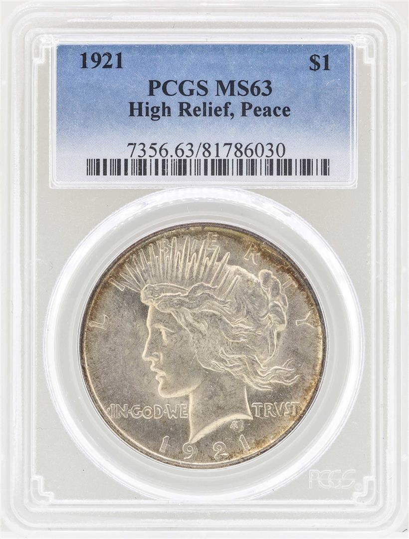 One 1921 $1 Peace High Relief Silver Dollar Coin PCGS MS63. PCGS Graded.