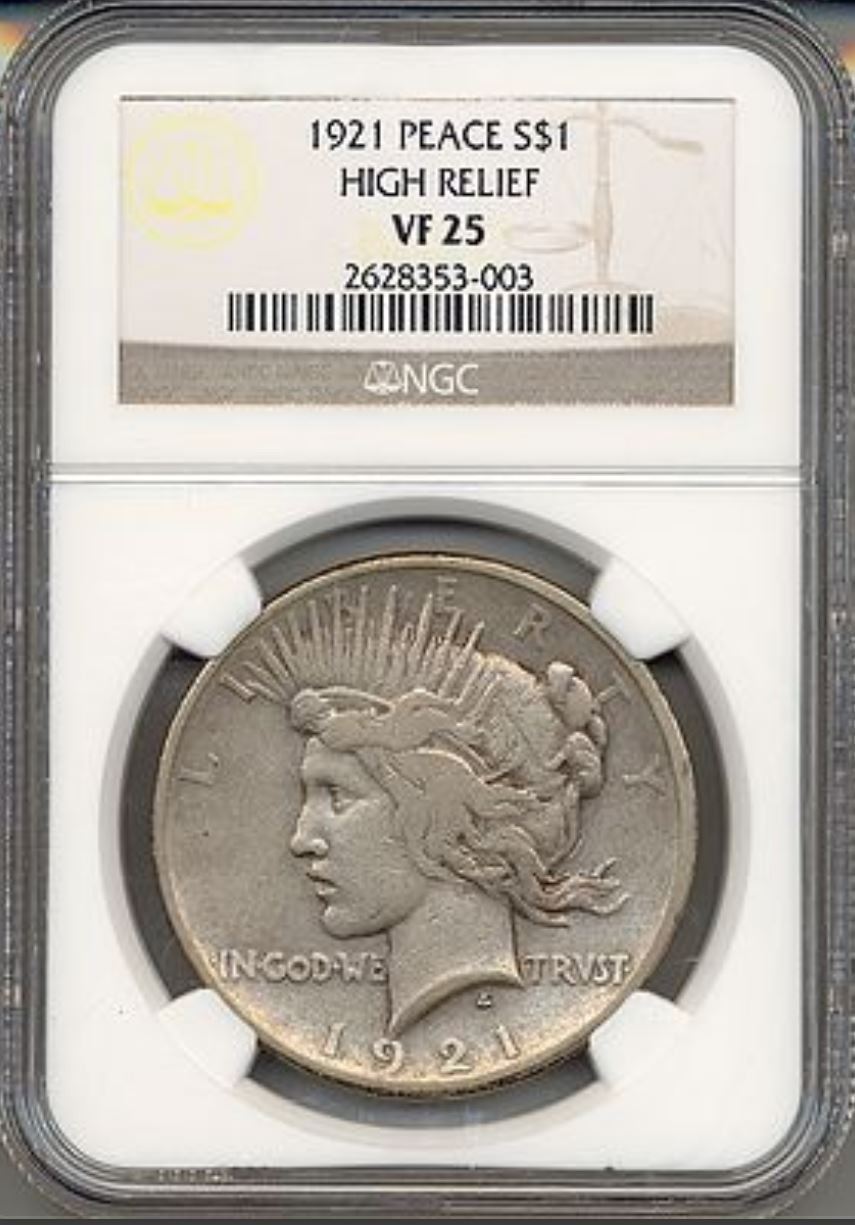 One 1921 $1 Peace High Relief Silver Dollar NGC VF25.