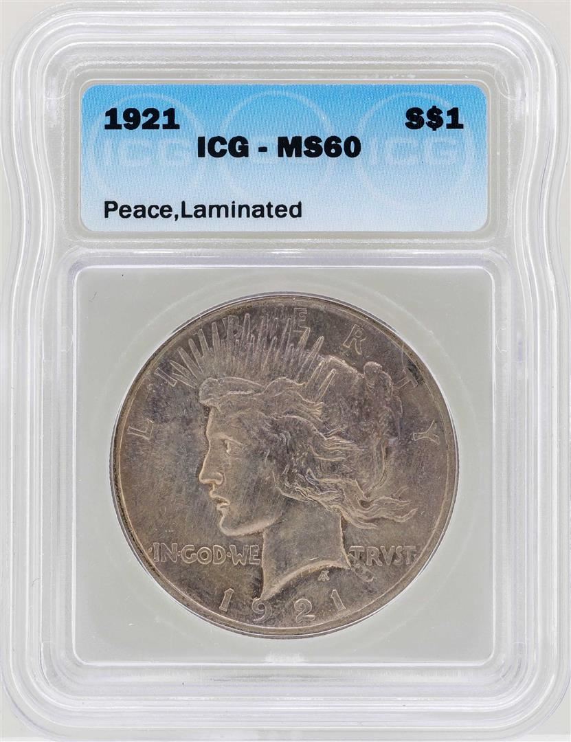 One 1921 $1 Peace Silver Dollar Coin ICG MS60. ICG Certified.