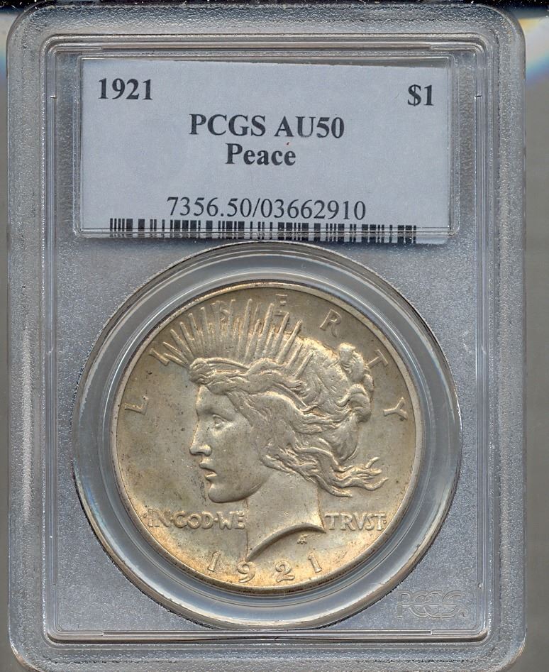 One 1921 $1 Peace Silver Dollar Coin PCGS AU50.