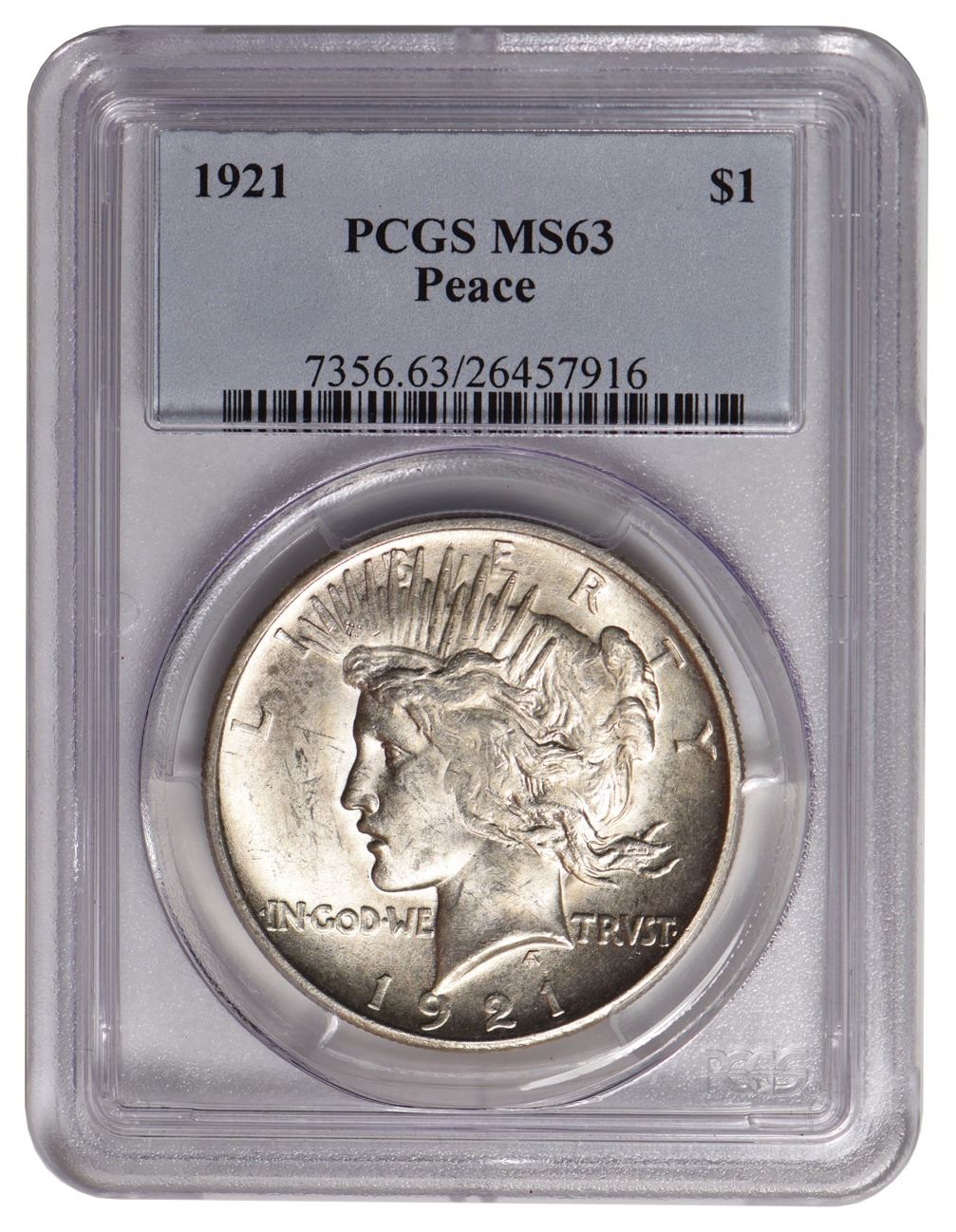 One 1921 $1 Peace Silver Dollar PCGS MS63.