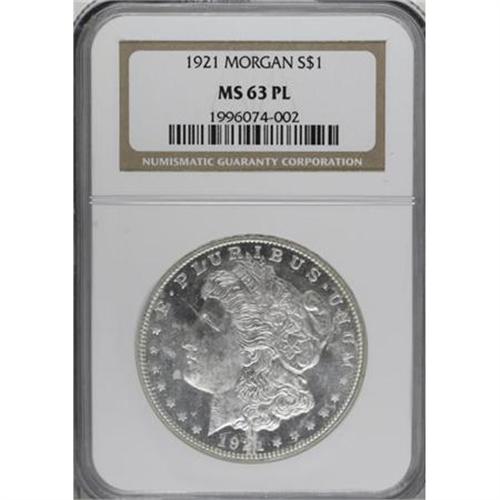 <B>1921 $1 MS63 Prooflike NGC.</B></I> NGC Census: (304/387). PCGS Population (106/97). Numismedia Wsl. Price for NGC/PCGS coin in MS63: $80. (#7297)<BR><BR><b>Shipping:</b> Coins & Currency (<a target="_blank" href="http://www.heritageauctions.com/common/shipping.php">view shipping information</a>)