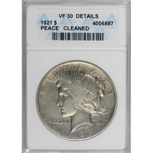 <B>1921 $1 --Cleaned--ANACS. VF30 Details.</B></I> NGC Census: (23/8694). PCGS Population (36/10655). Mintage: 1,006,473. Numismedia Wsl. Price for NGC/PCGS coin in VF30: $111. (#7356)<BR><BR><B>Coin Engraver:</B> Anthony de Francisci<BR><BR><b>Shipping:</b> Coins & Currency (<a target="_blank" href="http://www.heritageauctions.com/common/shipping.php">view shipping information</a>)