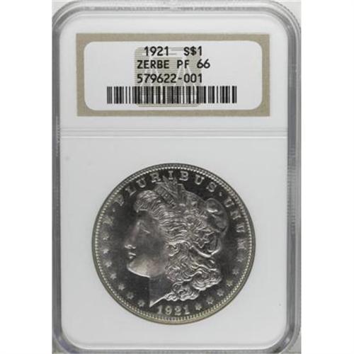 <B>1921 $1 Zerbe PR66 NGC.</B></I> While not of the same quality as the Chapman proofs of 1921, those struck for Farran Zerbe are much more available; some estimate as many as 200 pieces may have been produced. The diagnostic die scratch above the second U in UNUM is faintly visible under magnification, and, as reassuring as a diagnostic like that may be, it is really not necessary to confirm this coin's proof status. The surfaces are bright and highly lustrous. As on all Zerbes, there is a bit of cartwheel intermixed with the reflectivity in the proof fields. Delicate lilac patina embraces both obverse and reverse, but it is so light that at arm's-length the coin actually appears brilliant. A shallow blemish above Liberty's eye and another on the nose can be used to pedigree this specimen in the future. Census: 7 in 66, 1 finer (8/07). <BR><BR><BR><B>Coin Engraver:</B> George T. Morgan<BR><BR><b>Shipping:</b> Coins & Currency (<a target="_blank" href="http://www.heritageauctions.com/common/shipping.php">view shipping information</a>)