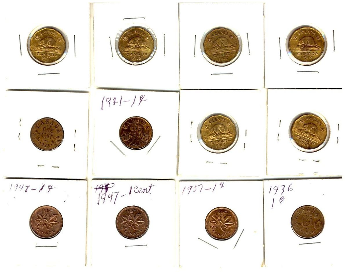 1921 1¢ to 1942 5¢. Lot of 12 coins including 1921 1¢, 1928, 1936, 1947, 1951 & 1942(6) 5¢. AU to