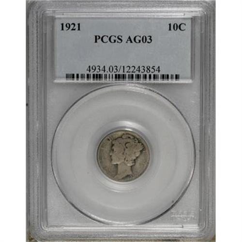 <B>1921 10C AG3 PCGS.</B></I> . PCGS Population (35/406). NGC Census: (18/237). Mintage: 1,230,000. Numismedia Wsl. Price for NGC/PCGS coin in AG3 : $27. (#4934)<BR><BR><B>Coin Engraver:</B> Adolph A. Weinman<BR><BR><b>Shipping:</b> Coins & Currency (<a target="_blank" href="http://www.heritageauctions.com/common/shipping.php">view shipping information</a>)