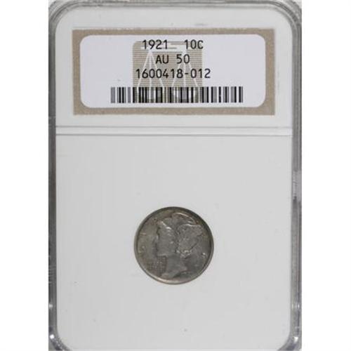 <B>1921 10C AU50 NGC.</B></I> NGC Census: (20/49). PCGS Population (17/61). Mintage: 1,230,000. Numismedia Wsl. Price for NGC/PCGS coin in AU50: $695. (#4934)<BR><BR><B>Coin Engraver:</B> Adolph A. Weinman<BR><BR><b>Shipping:</b> Coins & Currency (<a target="_blank" href="http://www.heritageauctions.com/common/shipping.php">view shipping information</a>)