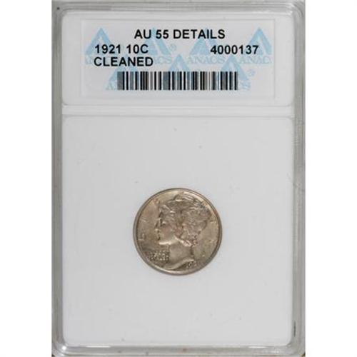<B>1921 10C --Cleaned--ANACS. AU55 Details.</B></I> NGC Census: (12/28). PCGS Population (22/26). Mintage: 1,230,000. Numismedia Wsl. Price for NGC/PCGS coin in AU55: $775. (#4934)<BR><BR><B>Coin Engraver:</B> Adolph A. Weinman<BR><BR><b>Shipping:</b> Coins & Currency (<a target="_blank" href="http://www.heritageauctions.com/common/shipping.php">view shipping information</a>)